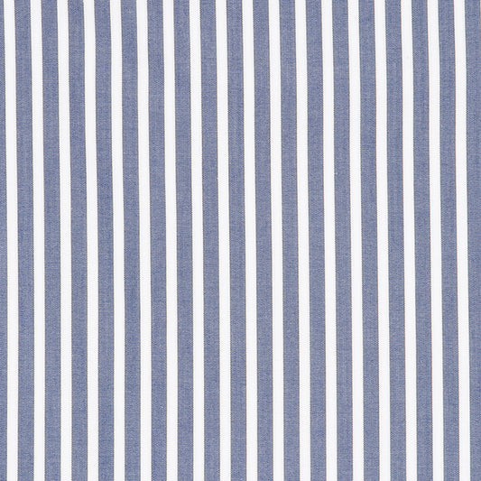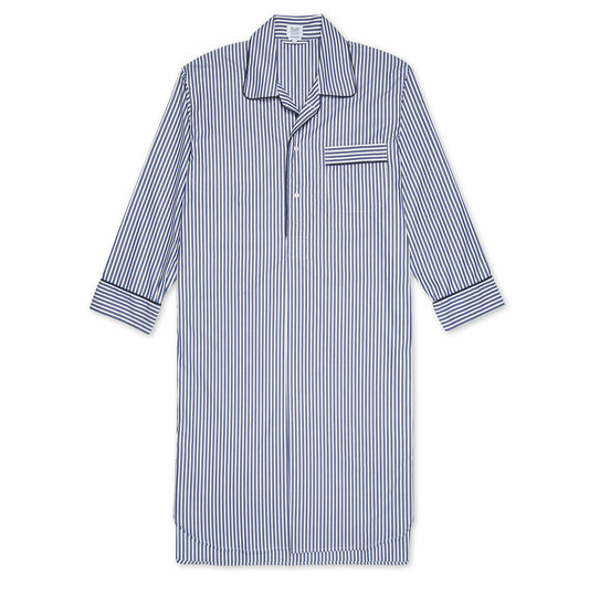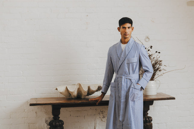 Man stood in Budd stripe blue dressing gown against white brick wall