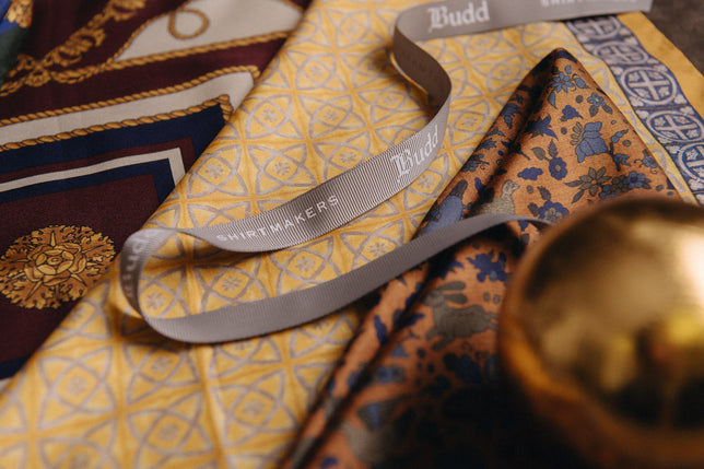 Gold bauble laid across gold and yellow patterned silk pocket squares and scarves