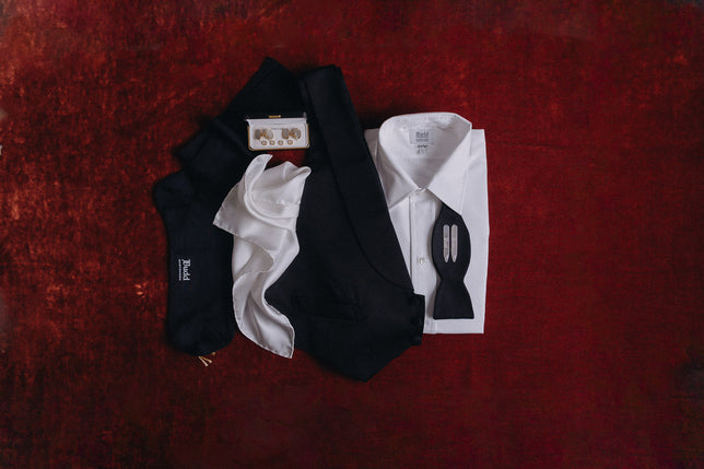 Black tie shirt and accessories laid out on red velvet background