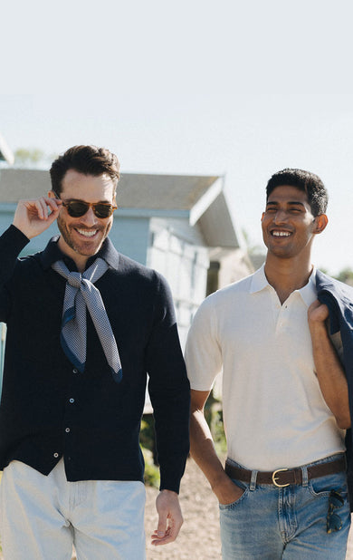 Our merino wool jumpers are fine enough to wear with tailoring whilst our cashmere sweaters and button gilets add texture and warmth. Our knitwear fits just right and we recommend sizing up if you prefer things a little looser.