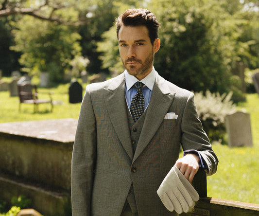 A black herringbone or featherweave coat worn with grey striped or puppy-tooth trousers is an excellent choice for Morning Wear occasions. This ensemble must include a waistcoat. This can be in traditional buff or grey, or for a flourish of colour, is wonderful in a pastel shade such as duck egg blue, yellow or pink. Stick to linen or wool for this. A grey Morning coat with matching vest and trousers is an equally good option, but allows for less creativity.
