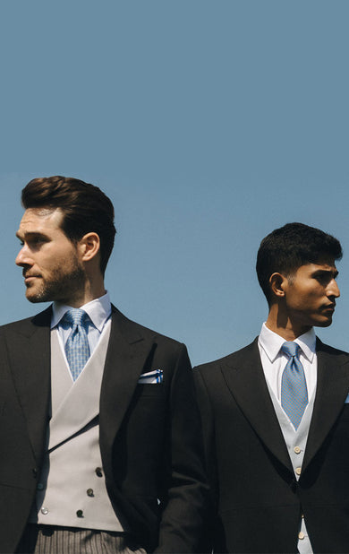 Perhaps the most fun of all dress codes, Morning Wear allows for creativity and colour, lending for elegance and individuality in equal measure. A dark morning coat and striped or puppy-tooth trousers perfectly set off a pastel or buff coloured vest. Shirt, tie and pocket square provide balanced contrast and harmony, bringing the whole look together. We do not endorse Ascots with Morning Dress, they belong to a wedding disco. Keeping it all grey? Then liven things up with your shirt and accessories.