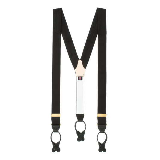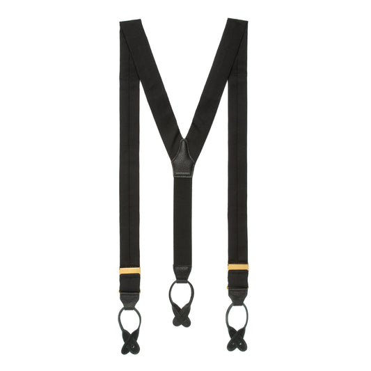 These black faille silk braces are made for Budd in England by the oldest manufacturer of braces in the world, Albert Thurston. Faille silk, with its subtle rib effect is both elegant and sturdy. The braces have a traditional button fitting with leather ends. The length of each strap is altered by elegant, narrow adjusters. The perfect accessory for any formal occasion whether Black or White Tie.